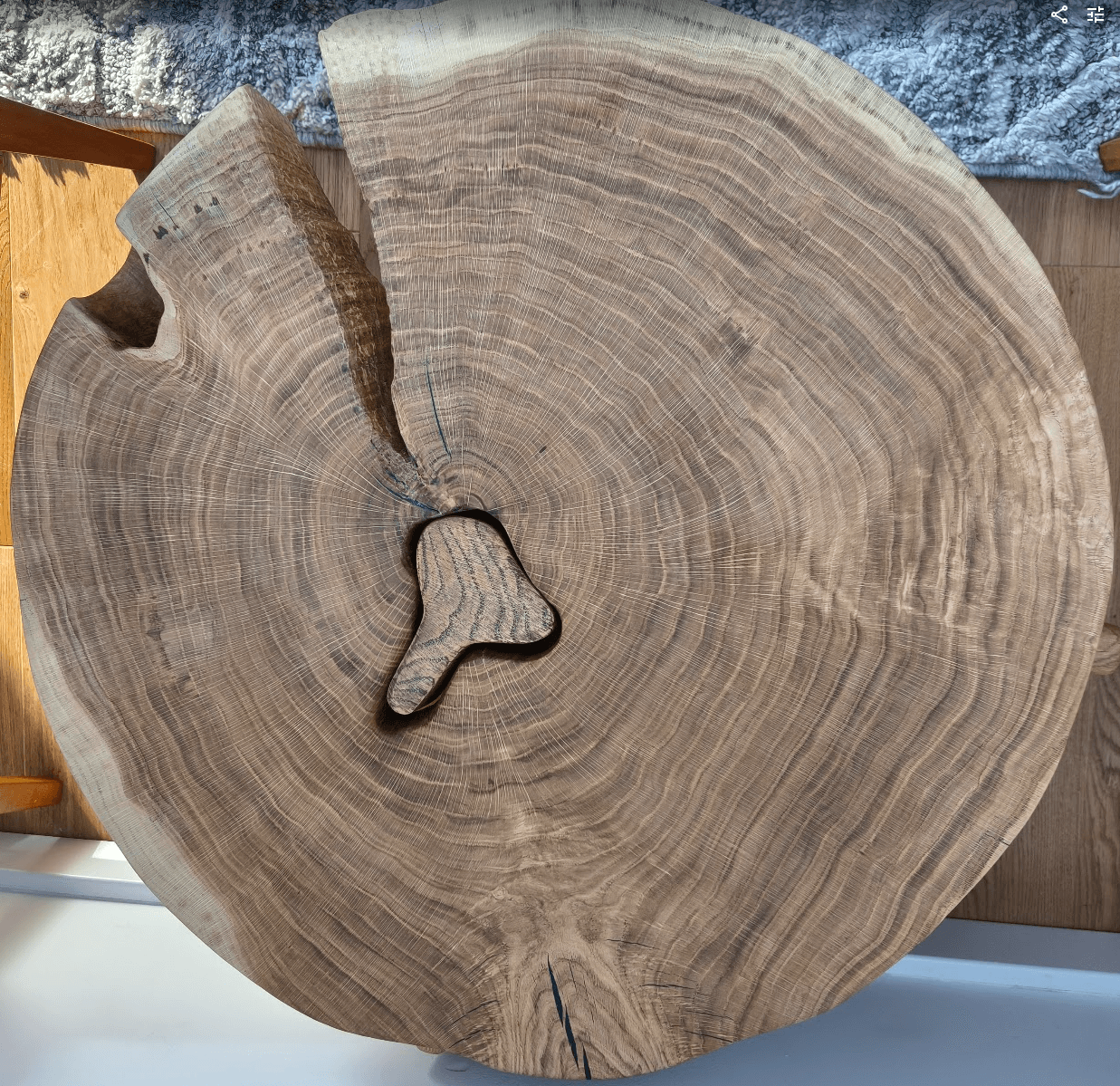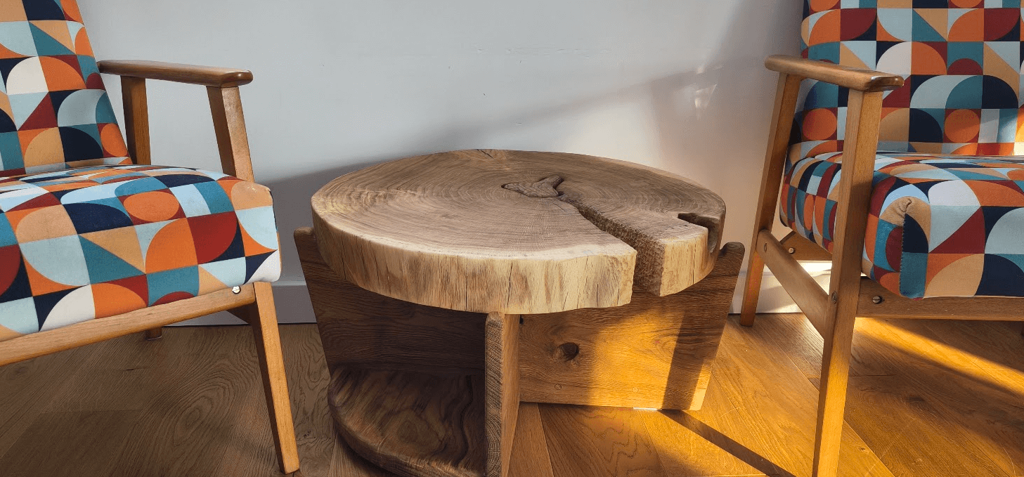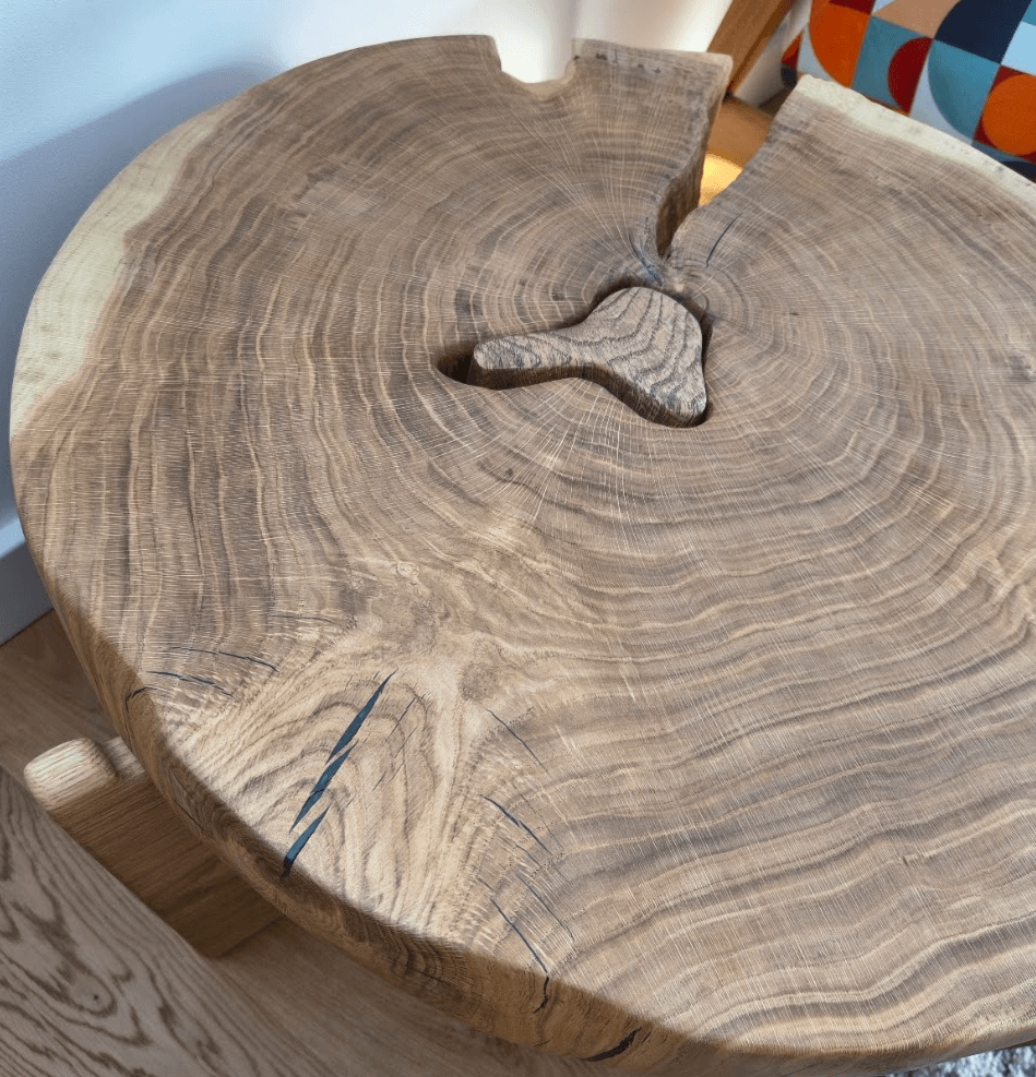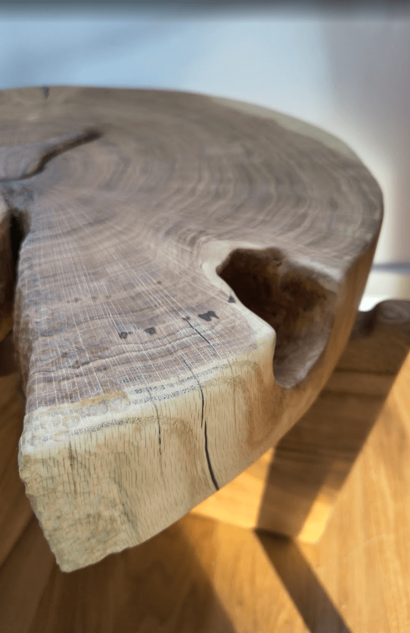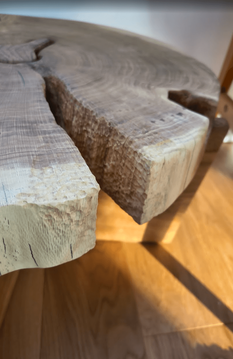 Materiał się nie poddawał. Pęknięcia wymagały stabilizacji. Twardość drewna walczyła z każdym narzędziem. Wykończenie krawędzi to było rzemiosło z gatunku "albo wyjdzie, albo wyląduję w psychiatryku".